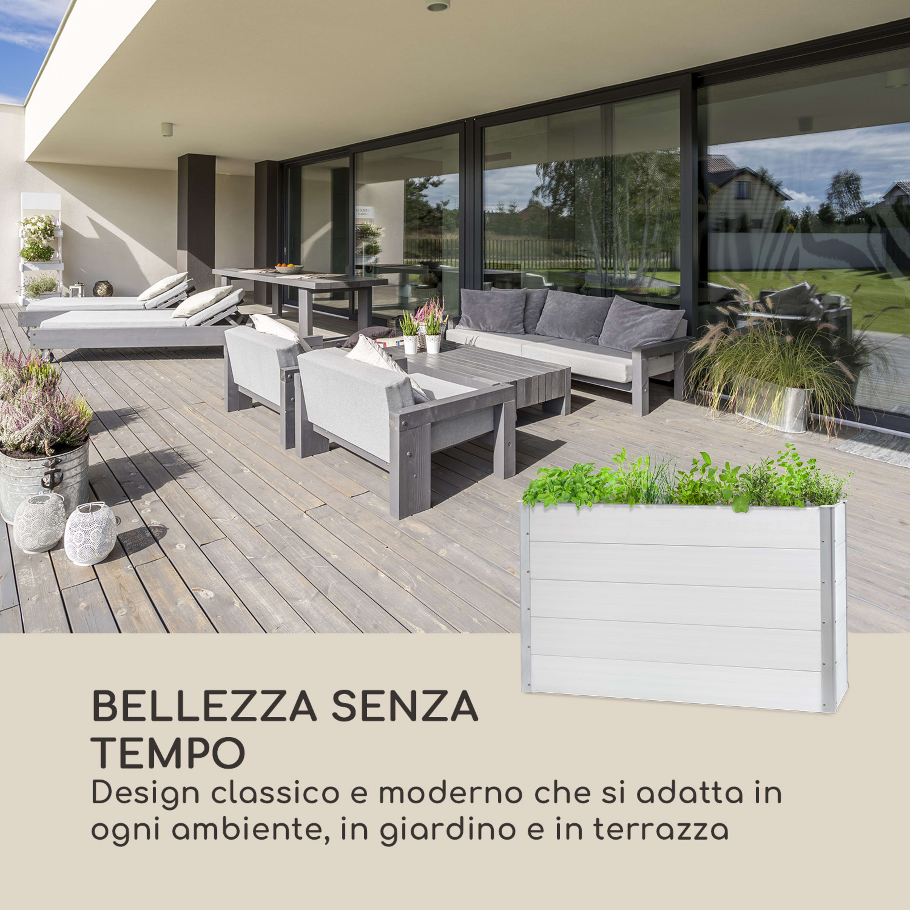 La stabile aiuola da giardino è realizzata in WPC (Wood Plastic Composite) resistente alle intemperie e, grazie alla protezione da gelo, ruggine e raggi UV, può essere lasciata senza problemi all'aperto. Con il suo naturale look effetto legno, la struttura si inserisce alla perfezione in ogni tipo di terrazza o giardino e impreziosisce l'ambiente con la sua fantastica tonalità bianca. Grazie a un'altezza di 91 cm, Nova Grow ti permette di prenderti cura delle tue piante comodamente, senza doverti piegare di continuo affaticando la schiena. L'aiuola rialzata può essere montata rapidamente e assicura robustezza e stabilità grazie ai 4 rinforzi di alluminio sugli angoli.