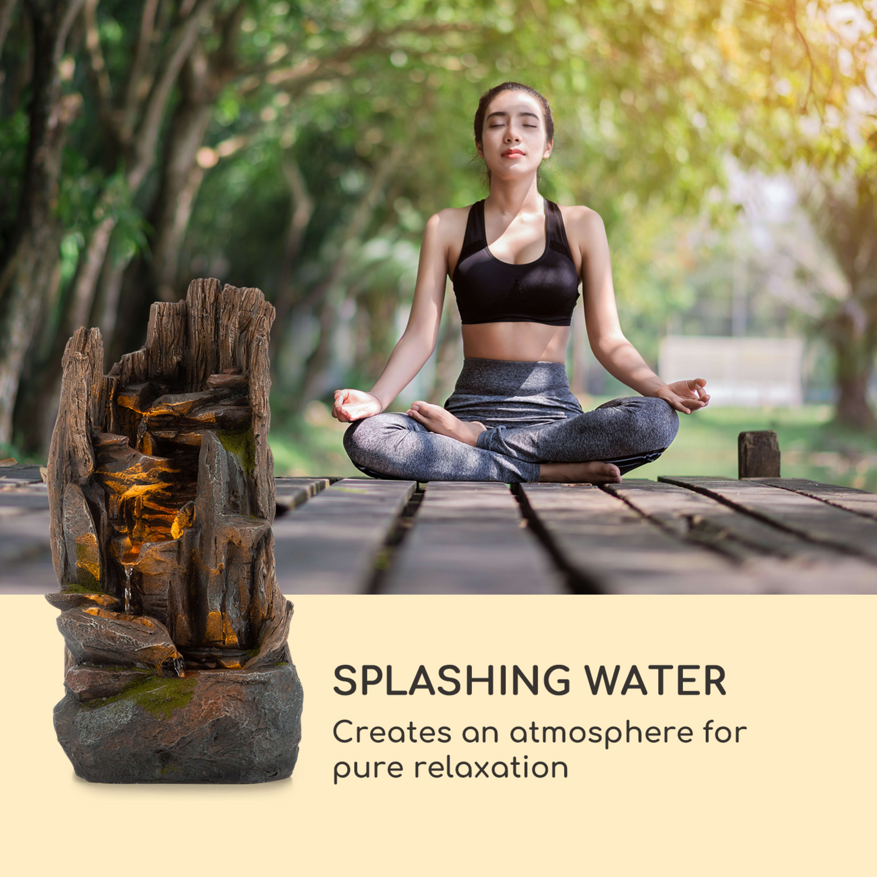 Il design raffinato della fontana solare Mystic Tree di Blumfeldt ha la forma di un vero tronco d'albero tramite il quale l'acqua fresca sgorga vivacemente. Dalle vasche sistemate una sopra l'altra nasce un gioco d'acqua armonico. Per risvegliare un'atmosfera calda, l'imitazione della cascata è attrezzata con luci a LED, che garantiscono dei bellissimi giochi di luce.