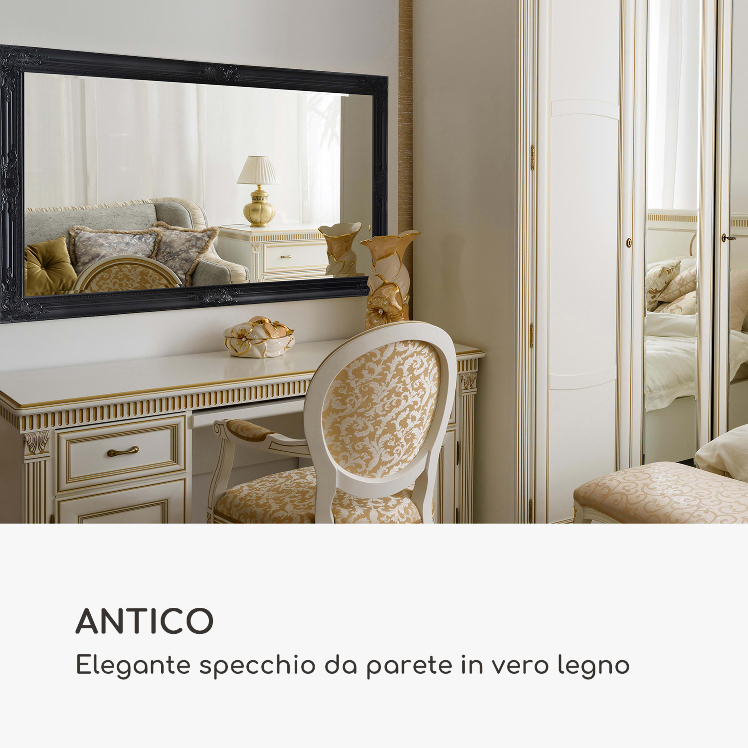 L'esclusivo specchio da parete Wembley di Casa Chick by blumfeldt conferisce a qualsiasi stanza un lussuoso tocco di rococò. Ornamenti artistici rivestono l'intera cornice dello specchio - forme e linee dolci li fanno sembrare delicatamente pomposi e rappresentano un bel dettaglio per tutti gli amanti delle epoche antiche. Grazie alle sue dimensioni, l'elegante specchio è ideale per l'ingresso, il soggiorno o anche la camera da letto e la cabina armadio di casa. Si può appendere in formato orizzontale o verticale o appoggiarlo a terra e fornisce un tocco di decorazione alla tua stanza. Sul retro si trovano già i ganci per un montaggio sicuro alla parete. Il vetro per specchi di alta qualità da 4 mm di spessore conferisce un riflesso realistico. Il vetro ha bordi smerigliati conici, che sottolineano abilmente l'esclusività dello specchio.